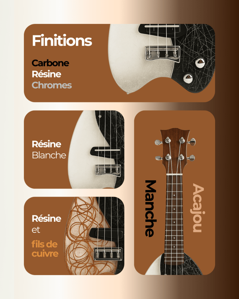Son design, atypique et résolument graphique, transforme l’instrument traditionnel en objet hybride, entre sculpture fonctionnelle et outil musical.
