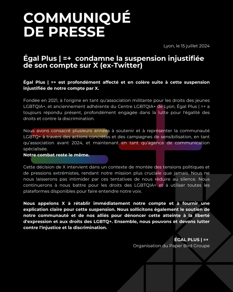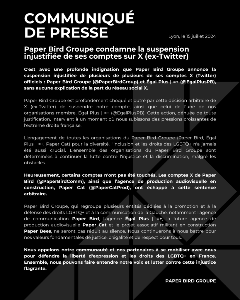 Projet : Réaction de Paper Bird Groupe et Égal Plus | =+ suite à le suspension des leurs compte X (ex-Twitter), juillet 2024.