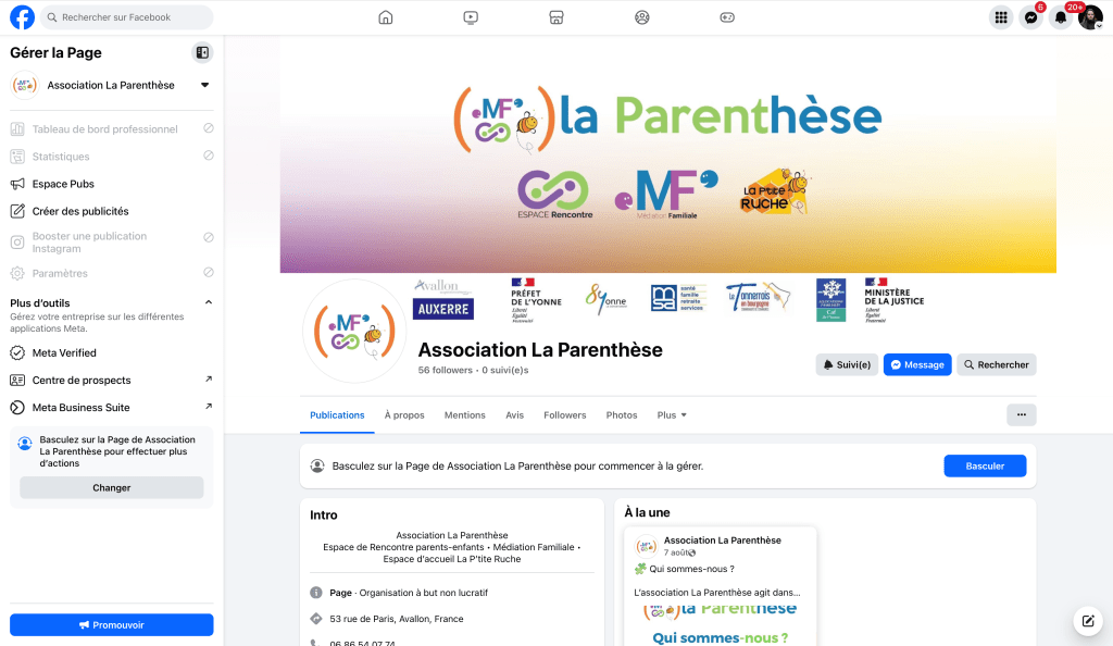 Projet : Page Facebook de l’association La Parenthèse à Avallon (médiation familiale, accueil parents-enfants), depuis août 2025